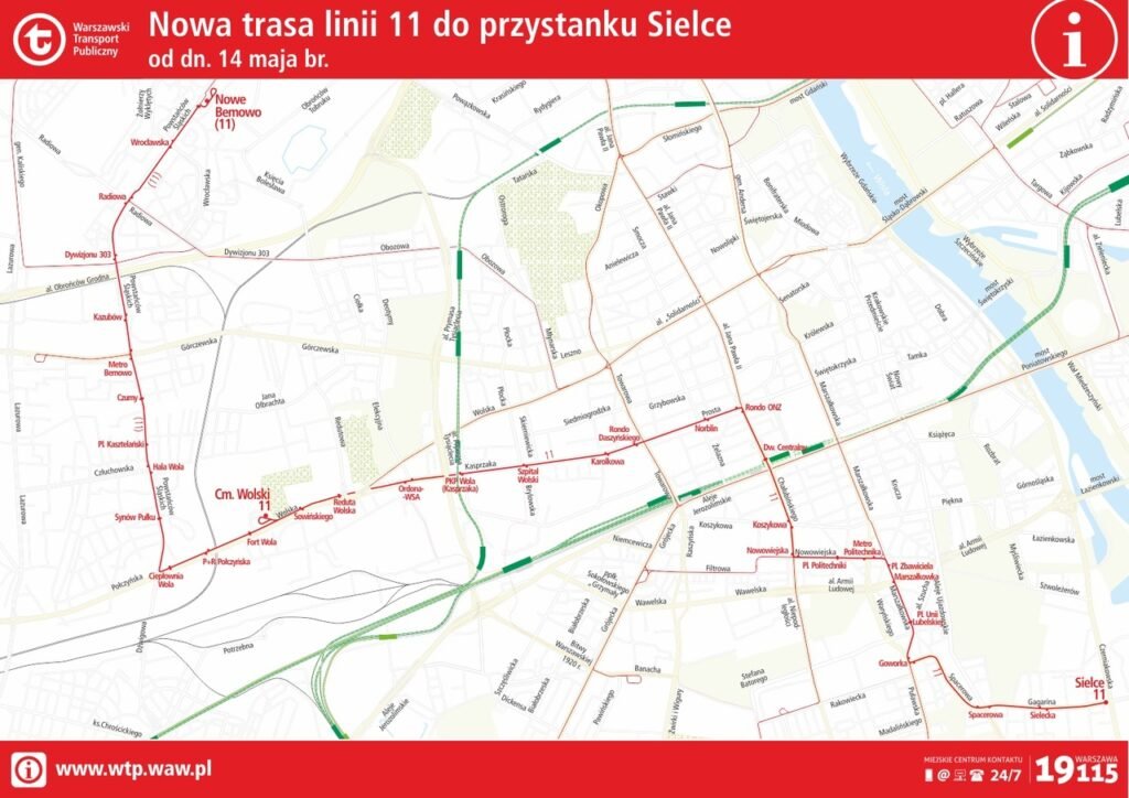 С 14 мая маршрут 11 от остановки «Sielce» будет проходить по улицам: Gagarina, Spacerową, Goworka, Puławską, через pl. Unii Lubelskiej, Marszałkowską, pl. Zbawiciela, Nowowiejską (станция метро Politechnika), al. Niepodległości, Chałubińskiego, al. Jana Pawła II (Dworzec Centralny), rondo ONZ, Prostą, Kasprzaka, Wolską, Połczyńską, Powstańców Śląskich до Nowe Bemowo. В часы пик (каждые 8 ​​минут), в полдень, вечером (каждые 12 минут) и в нерабочие дни (каждые 15 минут) — только на участке: Sielce — Cmentarz Wolski.