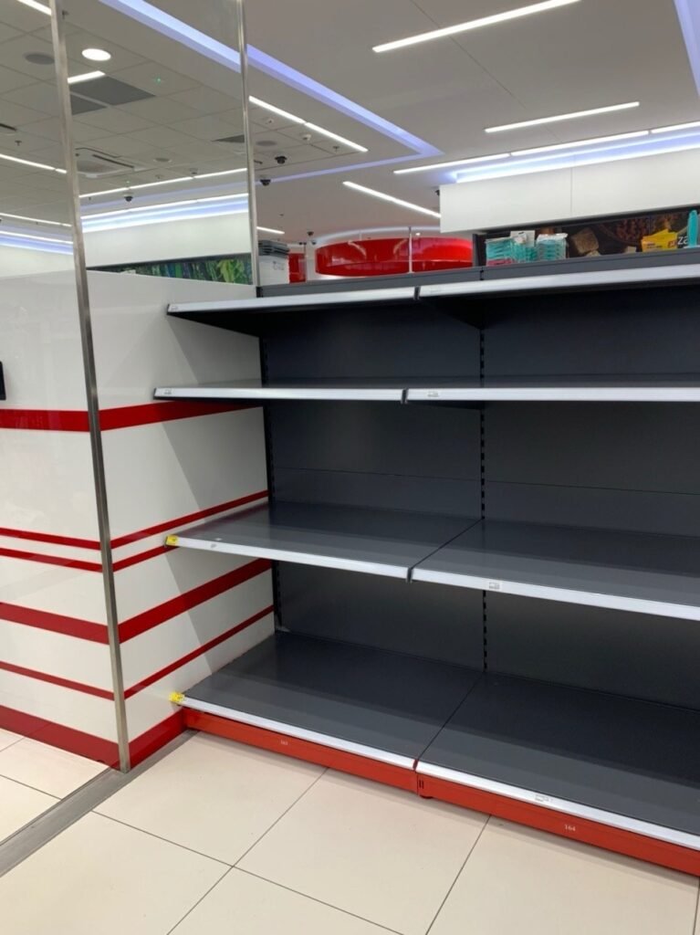 Так выглядели полки магазинов в первые дни эпидемии: