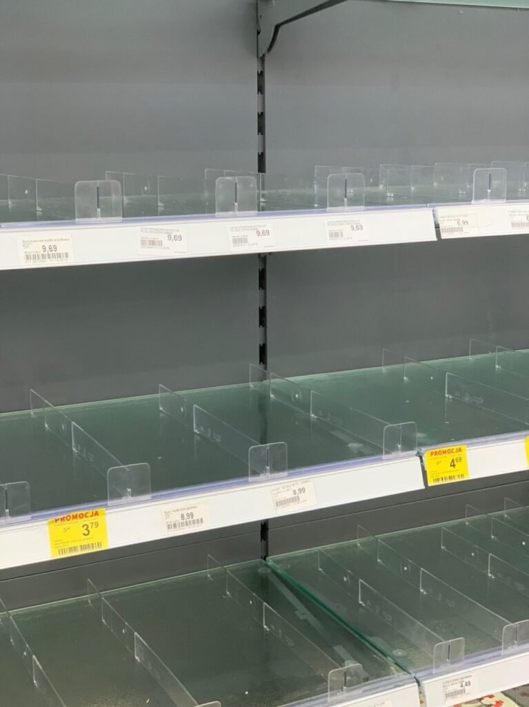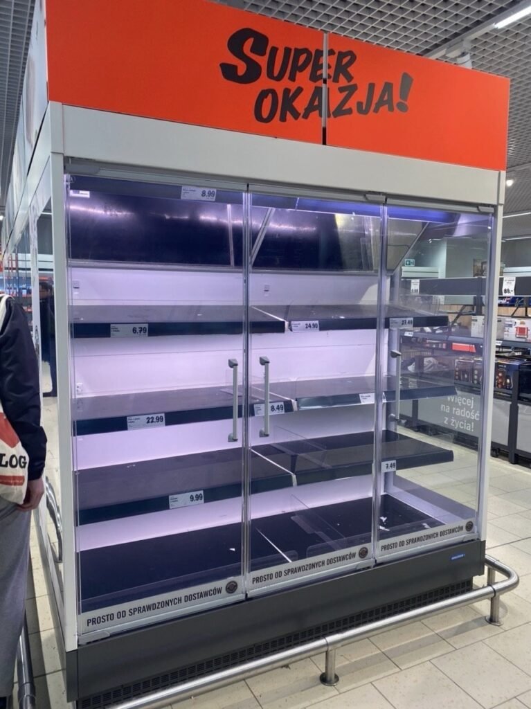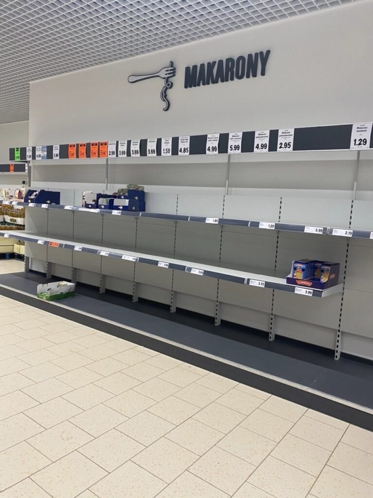 Первый подтверждённый случай заражения в Польше зарегистрировали 4 марта. В следующие дни страну охватила паника из-за неизвестного возбудителя. Люди начали массово скупать в магазинах продукты длительного хранения и туалетную бумагу.