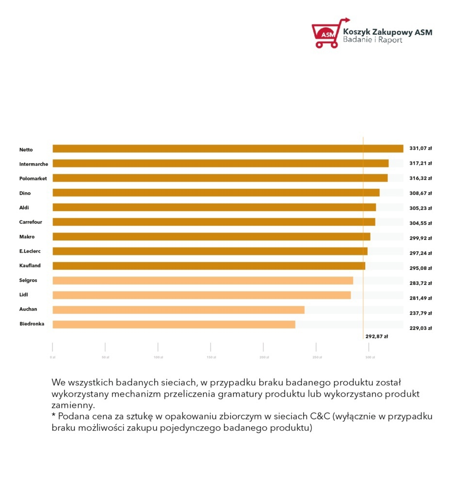 Разница в средней цене корзины между первым, вторым и третьим магазинами в рейтинге составила на 8,76 злотых (Auchan) и на 52,46 злотых (Lidl) больше соответственно. Самая высокая стоимость потребительской корзины в марте 2024 года была зафиксирована в сети Netto, где анализируемый набор товаров стоил 331,07 злотых.
