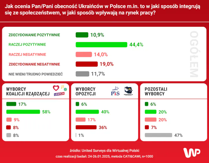 В сентябре 2023 года 64,4% опрошенных положительно оценивали присутствие украинцев в Польше, однако в январе 2025 года этот показатель снизился на 9,1% и составил 55,3%. При этом 10,9% респондентов выразили определенно положительное мнение, а 44,4% — скорее положительное. Одновременно выросла доля негативных оценок: теперь 33% поляков настроены негативно, из них 14% относятся к украинцам скорее отрицательно, а 19% — определенно отрицательно.