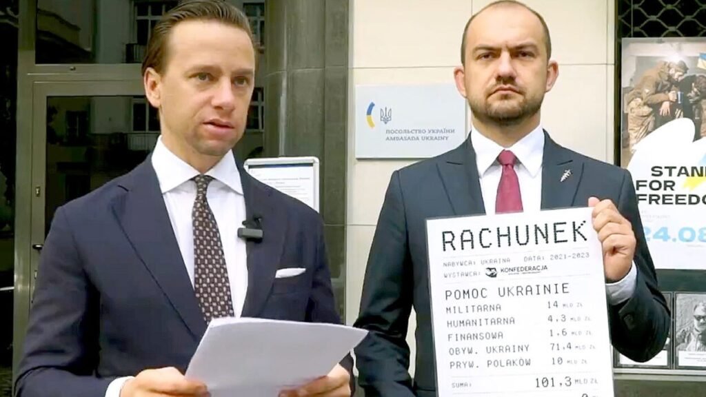 Депутат Конфедерации Кшиштоф Босак, возмущённый решением Украины пожаловаться на Польшу во Всемирную торговую организацию, вышел со «счётом» за помощь в размере 101 млрд злотых к посольству Украины.