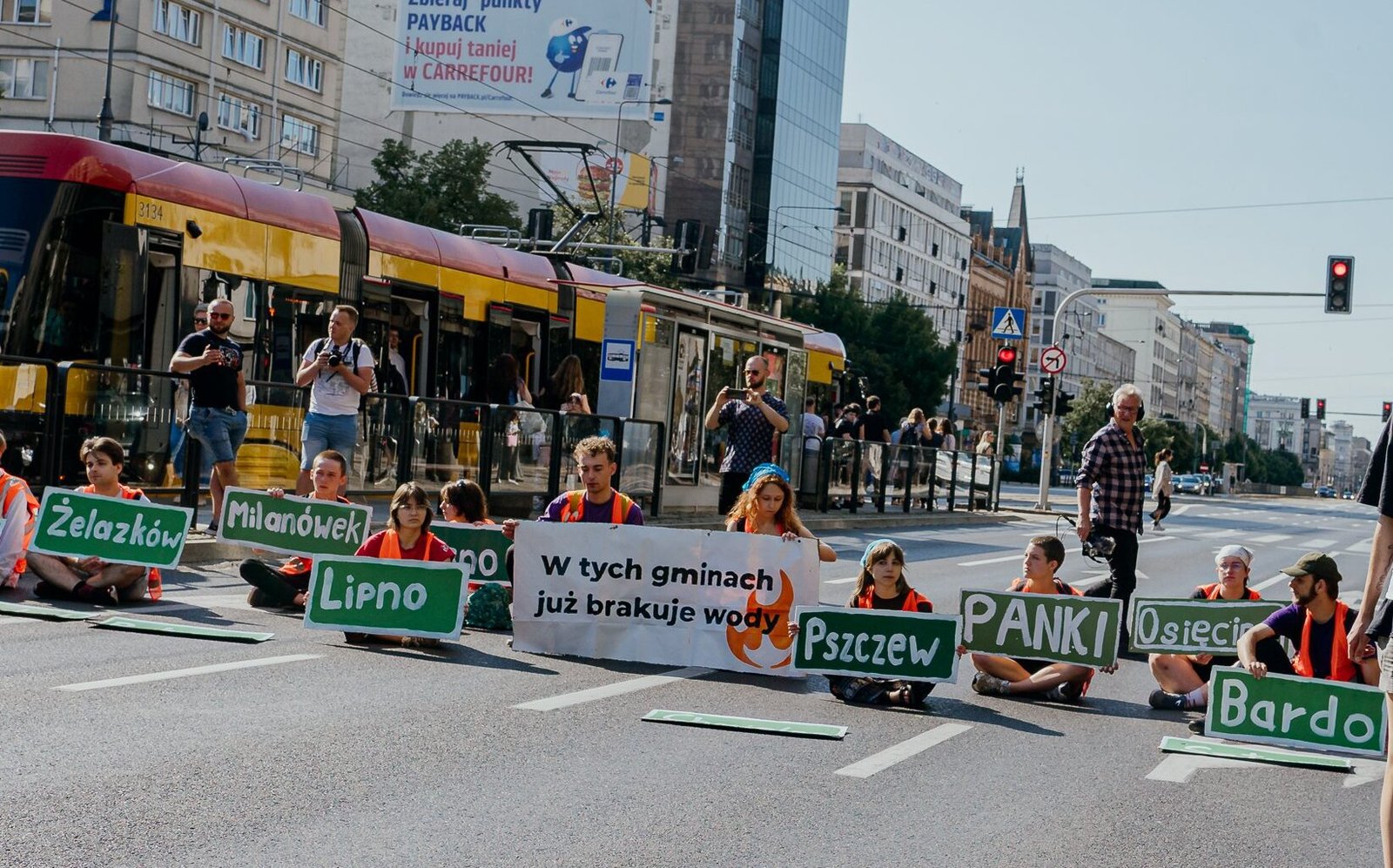В четверг утром, 18 июля, активисты группы «Последнее поколение» устроили очередную акцию протеста и перекрыли улицу Marszałkowska в центре Варшавы. В руках активисты держали таблички с названиями гмин, где власти призвали экономить воду, и приклеили себя к асфальту.