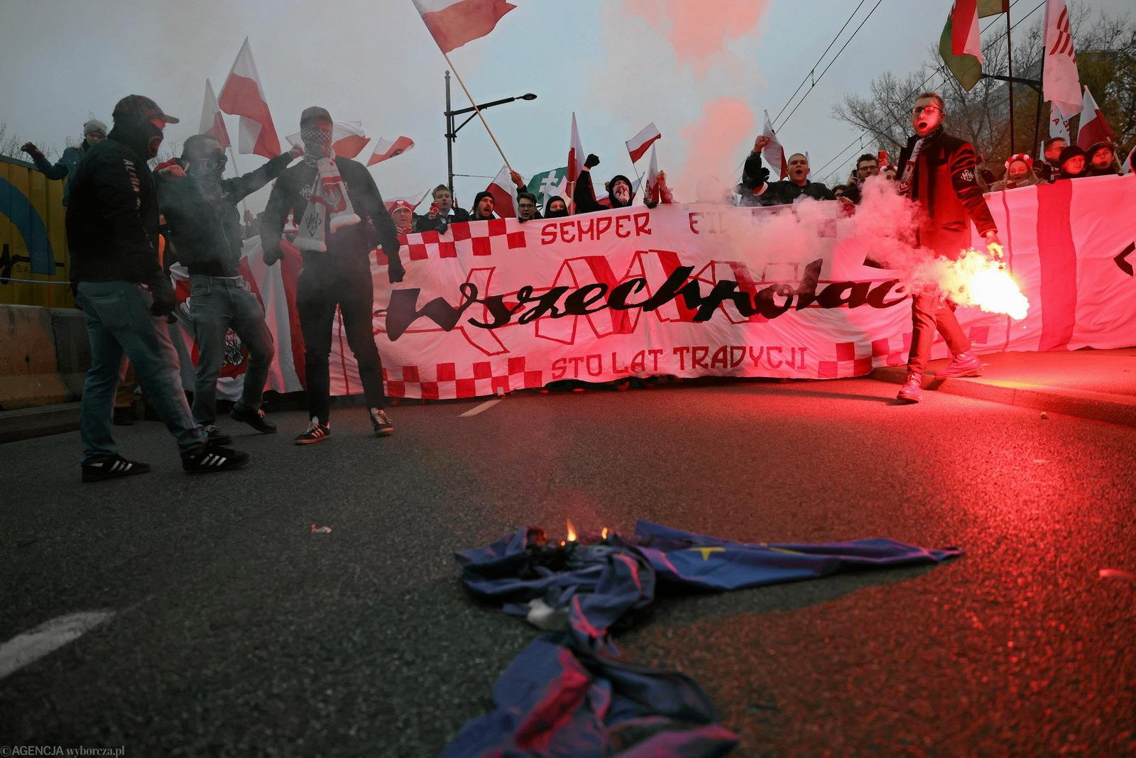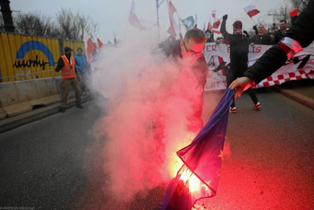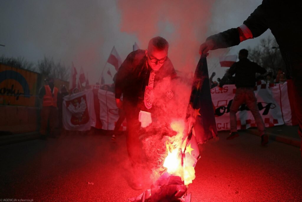 Затем президент организации «Młodzież Wszechpolska» Марцин Осовски, несмотря на запрет на использование файеров, поджёг сигнальной ракетой флаг Евросоюза. При этом он скандировал: «Тряпка горит!», что поддержала толпа громким «Долой Евросоюз». Обрывки синего полотна догорали на асфальте, демонстрируя откровенную антиевропейскую агрессию.