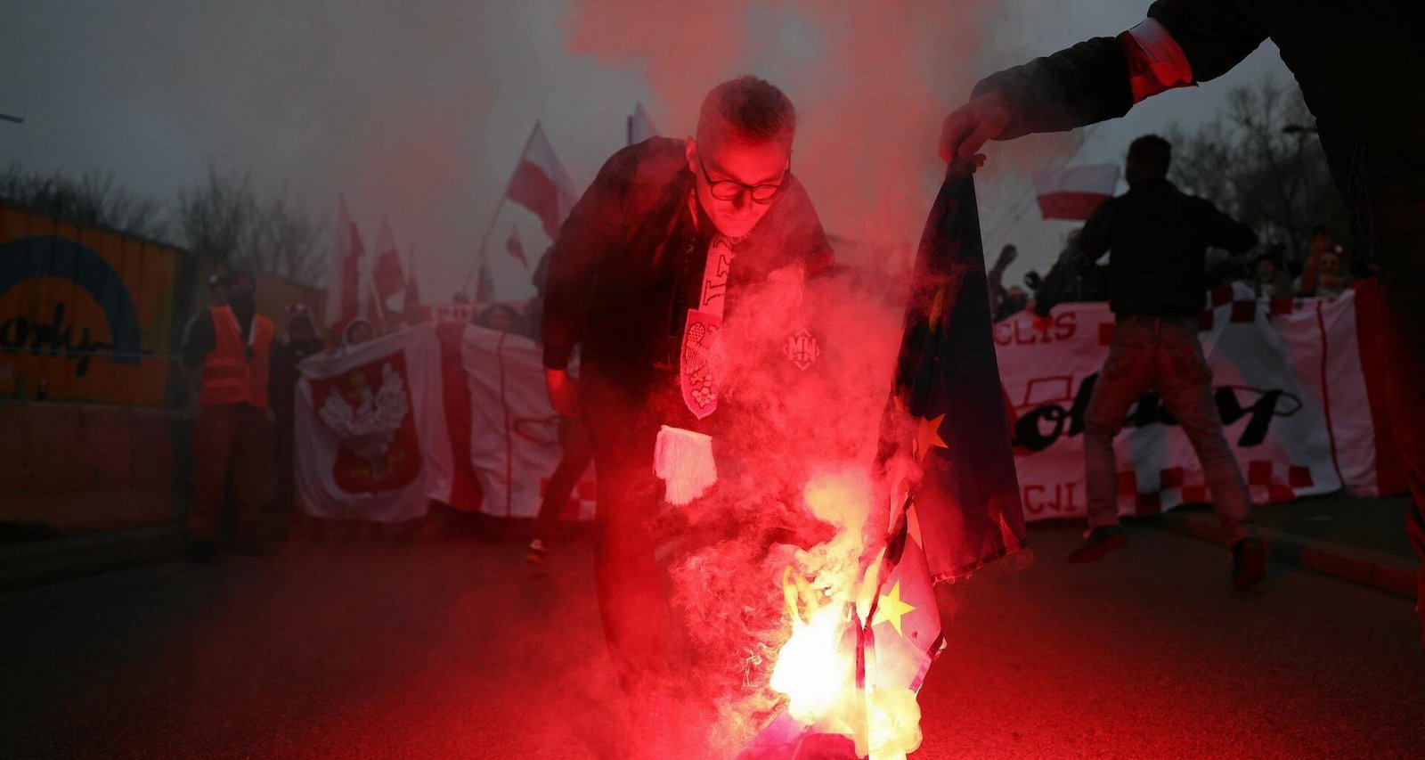 «Флаг ЕС — тряпка оккупанта, уничтожающего Польшу» — на Марше Независимости в Варшаве подожгли флаг ЕС