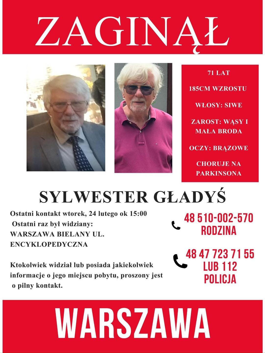 Семья узнала о пропаже мужчины лишь 2 дня спустя. С момента исчезновения он не принимал лекарства, не спал в своей квартире, а его телефон не работает. Он также не появлялся в университете. Гладысь работает на факультете Транспорта Политехники Варшавской. Никто ничего не знает.