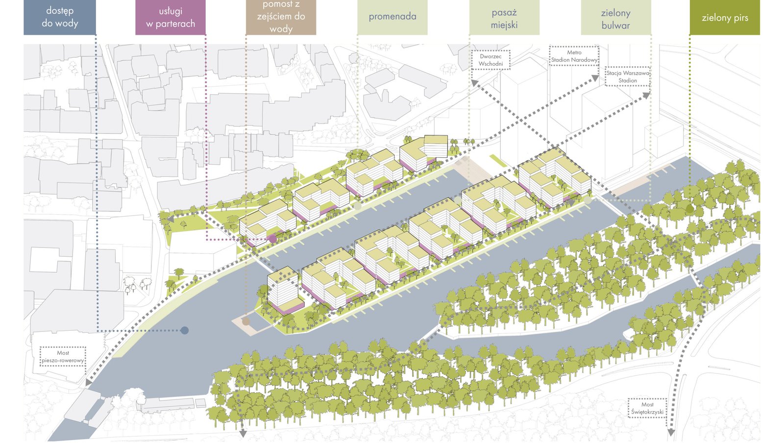На варшавской Праге запланированы масштабные изменения — власти намерены модернизировать пражский порт (Port Praski). Территория между станцией «Национальный Стадион» и рекой Висла должна стать новым оживлённым прибрежным районом благодаря проекту, которым руководит организация «APA Wojciechowski Architekci».