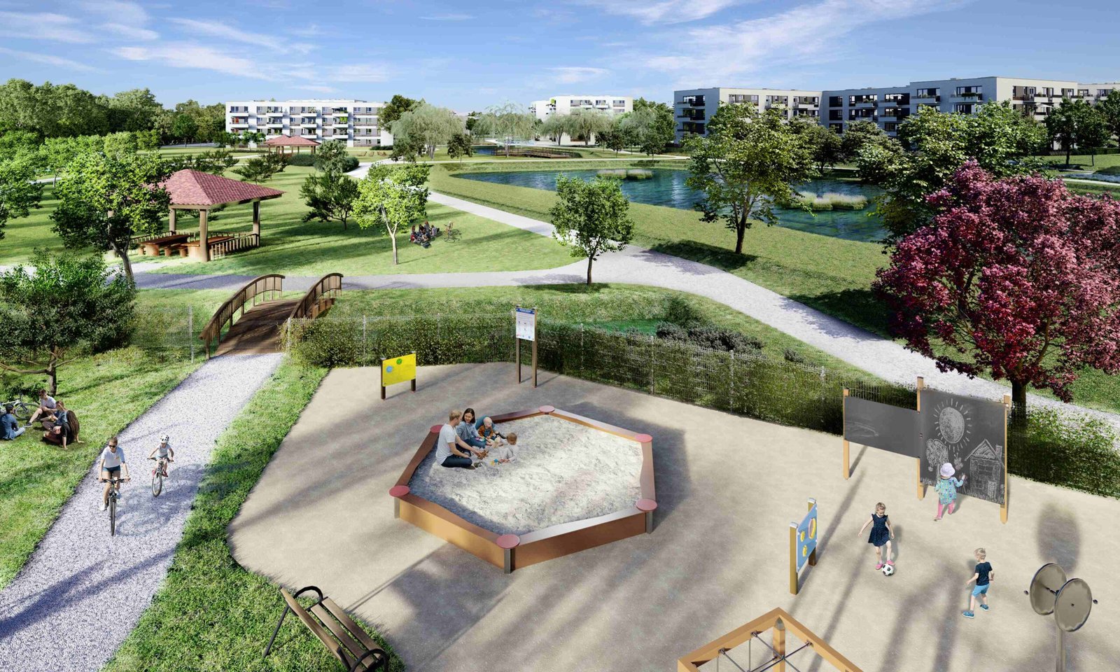 Помимо водоёмов, на площади около 5 Га будет создан парк с развлекательной и рекреационной инфраструктурой. Он будет оборудован прогулочными дорожками, деревянными навесами со столиками, шезлонгами и кинотеатром.