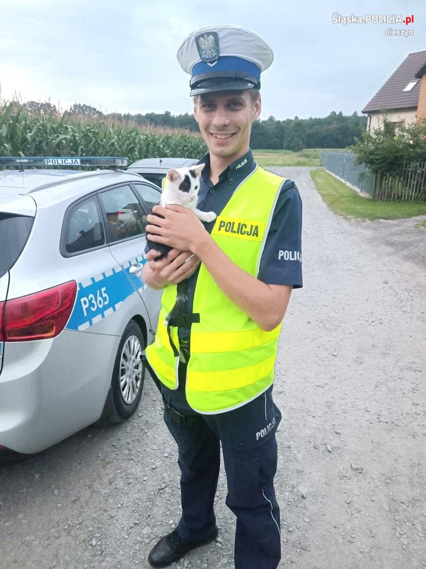 Полицейский из группы «SPEED» в Цешине стал героем ночного дежурства, когда он обнаружил маленького котёнка, бегущего по национальной дороге № 81.