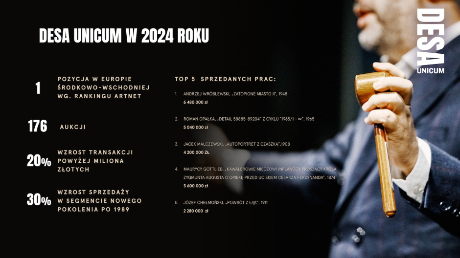 DESA Unicum завершила 2024 год с оборотом в 214,6 млн злотых и 176 проведенными аукционами, из которых около 30 работ превысили рубеж в 1 миллион злотых. Это на 20% больше по сравнению с предыдущим годом, что подтверждает не только растущий интерес к искусству, но и рост стоимости рынка.
