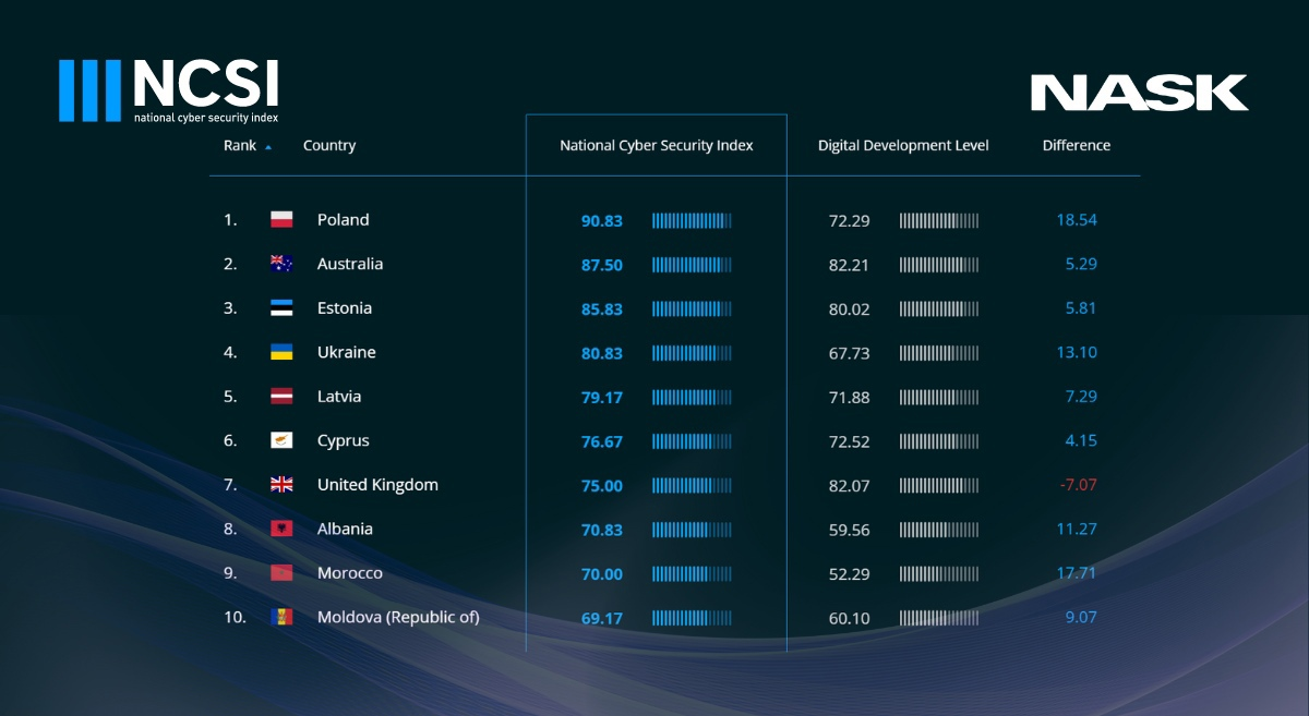 Польша получила 90,83 балла в рейтинге NCSI из 100 возможных баллов, опережая Австралию (87,50 балла) и Эстонию (85,83 балла). В список вошли в общей сложности 32 страны со всего мира.