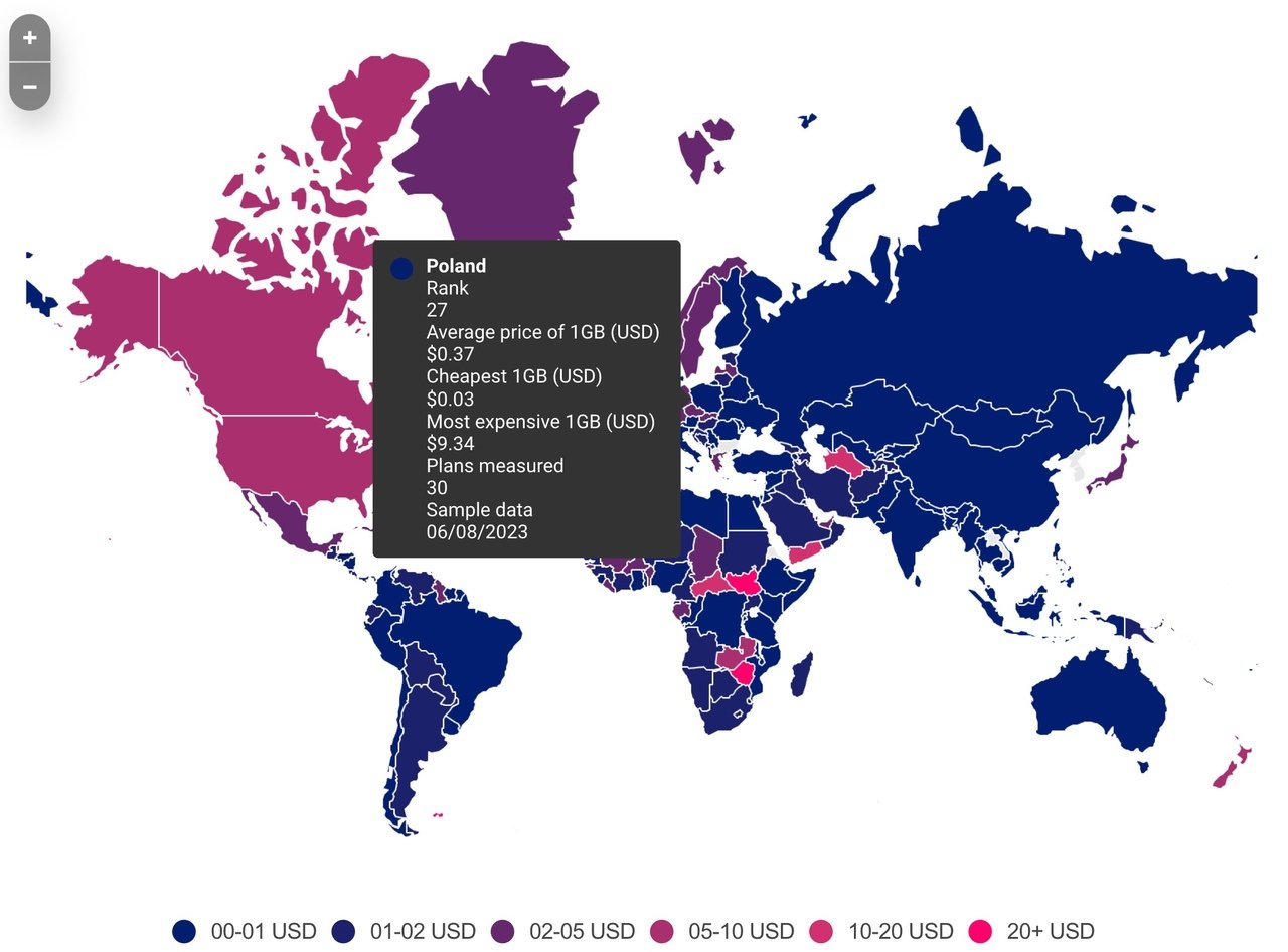 Польша тоже входит в список стран с дешёвым интернетом и отмечена на карте синим цветом. Она заняла 26 место из 237 (в среднем — $0,37 за гигабайт). У России — 15-е место ($0,25), у Украины 16-е место (0,27 за гигабайт), у Литвы — 117-е ($1,26), у Германии 163 место ($2,14), у Словакии 182-место ($2,68), а у Чехии 193 место ($3.12), а у Латвии — 197-е ($3,21).