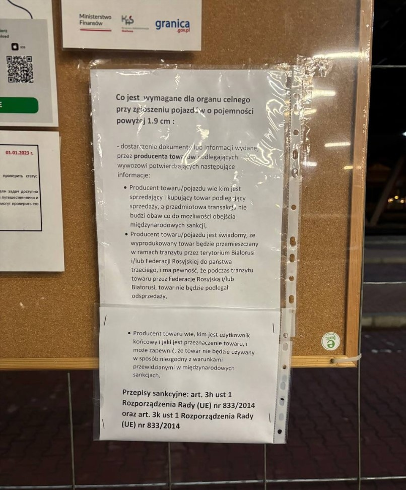 — Информация с польской границы следующая: ночью приезжал на пункт пропуска министр транспорта Польши и распорядился о недопущении пропуска автомобилей, следующих в страны ЕАЭС, с объёмом двигателя свыше 1,9 литра, а также автомобилей стоимостью свыше 50 000 евро, независимо от объёма двигателя. При попытке вывоза таких автомобилей необходимо предоставить справку производителя товара (справку с завода) о том, что завод не имеет претензий к вывозу такого автомобиля на территорию ЕАЭС.
