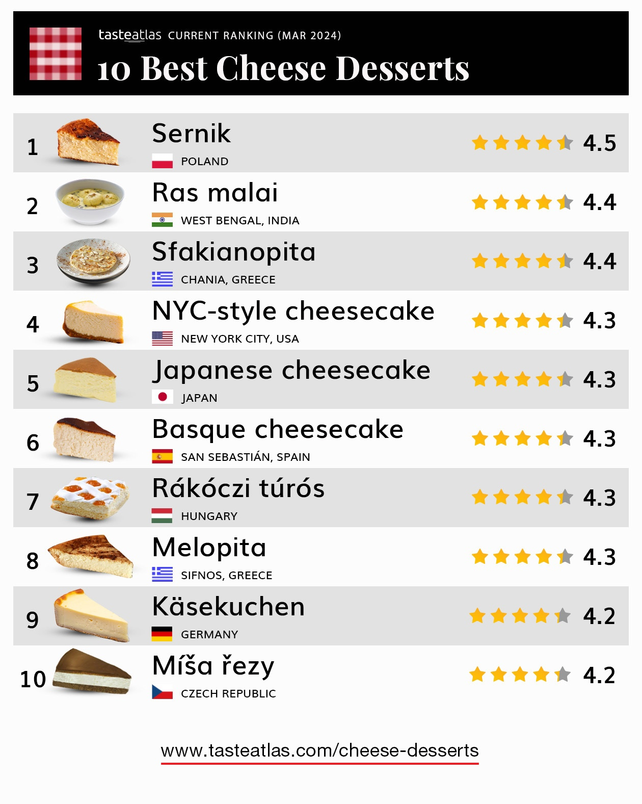 Taste Atlas опубликовал список лучших сырных десертов в мире. Первое место занял польский серник. Он получил оценку 4,5. На втором месте оказался индийский десерт рас малай (сладкие шарики из сыра чхана, обмакнутые в сгущённое молоко с добавлением шафрана и кардамона), а на третьем месте — сфакианопита из Греции (тонкая лепешка с начинкой из сыра и покрытая мёдом).