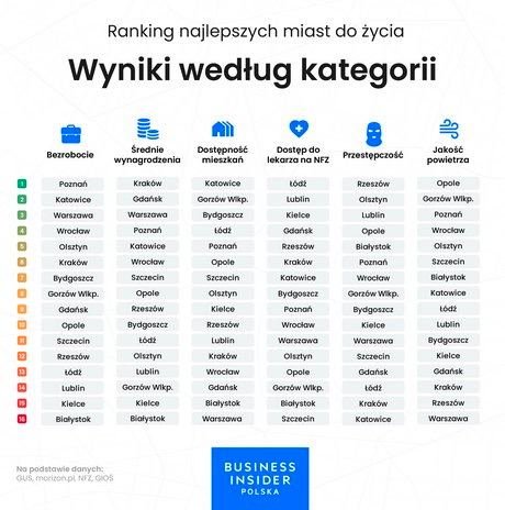 Портал Business Insider провёл анализ 16 городов Польши, оценив уровень безработицы, заработной платы, преступности, качество воздуха, цены на квартиры на вторичном рынке и доступ к врачам в Национальном фонде здравоохранения.