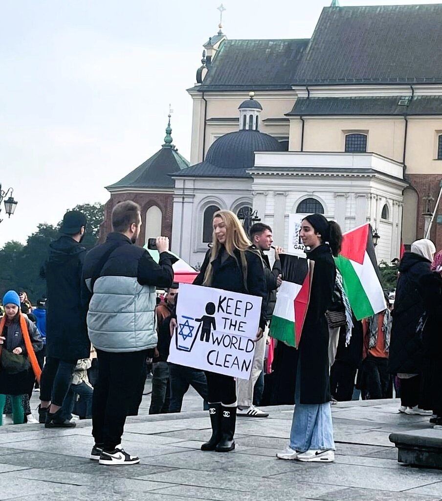 Наибольшие негодования вызвал баннер, который несла молодая женщина с надписью «Сохраним мир чистым» и урной со «Звездой Давида». СМИ подхватили это фото утверждая, что люди с про-палестинскими настроениями хотят уничтожить всех евреев. Однако мы нашли видео, где девушка с этим плакатом заявила, что она и протестующие палестинцы любят всех евреев, мусульман и христиан, а надпись на плакате направлена против правительства Израиля.