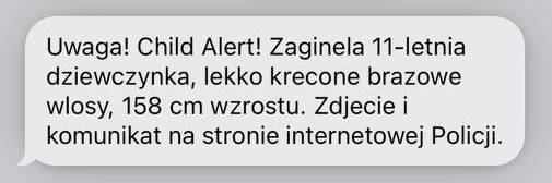 «Uwaga! Child Alert! Zaginęła 11-letnia dziewczynka, lekko kręcone brązowe włosy, 158 cm wzrostu. Zdjęcie i komunikat na stronie internetowej Policji», — такое смс было отправлено всем жителям Польши 14 мая.