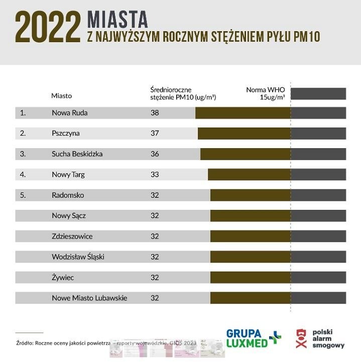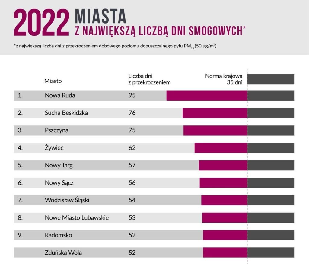 Polski Alarm Smogowy опубликовала новый рейтинг самых задымлённых городов и посёлков Польши за 2022 год. Город Нова-Руда второй год подряд оказался на вершине рейтинга, причем во всех трёх категориях. В 2022 году было зафиксировано наибольшее количество смоговых дней (95 дней), самая высокая концентрация PM10 и самая высокая концентрация канцерогенного бензо[a]пирена — 9 нг/м³, или 900% от нормы.