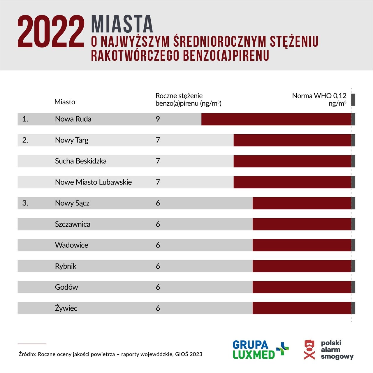 Также на вершите рейтинге находится большое количество населённых пунктов из Малопольского воеводства (5 из 15 с самыми высокими концентрациями бензо[а]пирена). Именно в этом воеводстве по решению Sejmiku Województwa было разрешено расширенное использование ископаемого топлива. Это свидетельствует о том, что антисмоговые нормы оказывают влияние на воздух, которым мы дышим.
