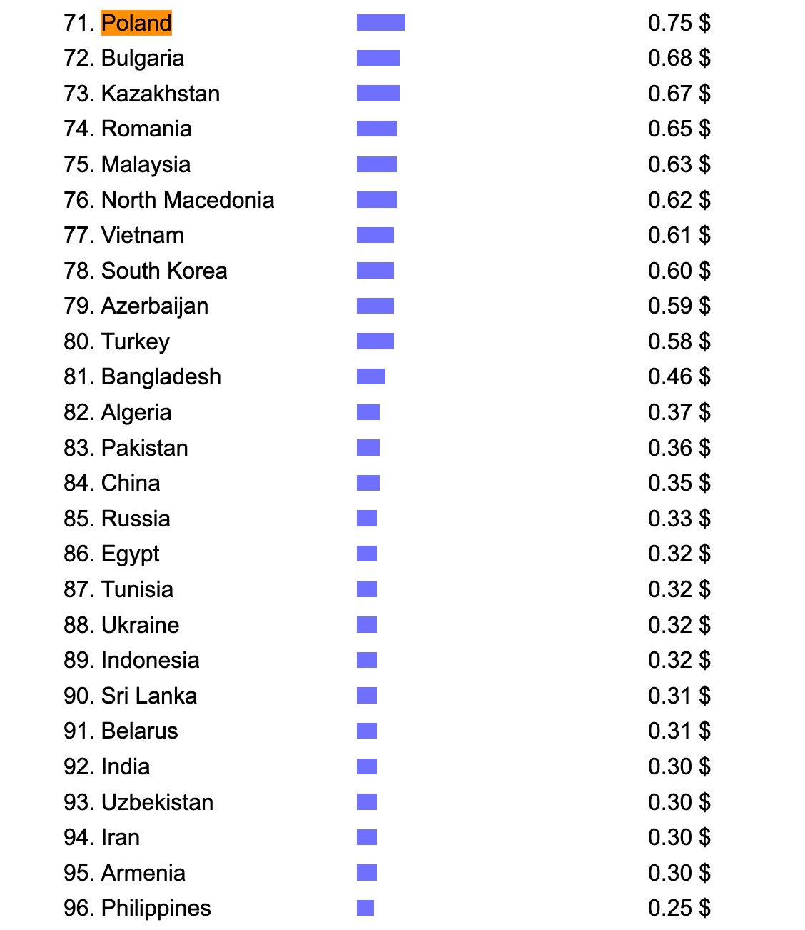 В соседней Беларуси (91 место) стоимость за 1 км пути — 0,31$, в Украине (88 место) — 0,32$, в России (85 место) — 0,33$, в Литве (55 место) — 0,98$, в Чехии (41 место) — 1,32$, в Словакии (48 место) — 1,09$ и в Германии (16 место) — 2,17$,