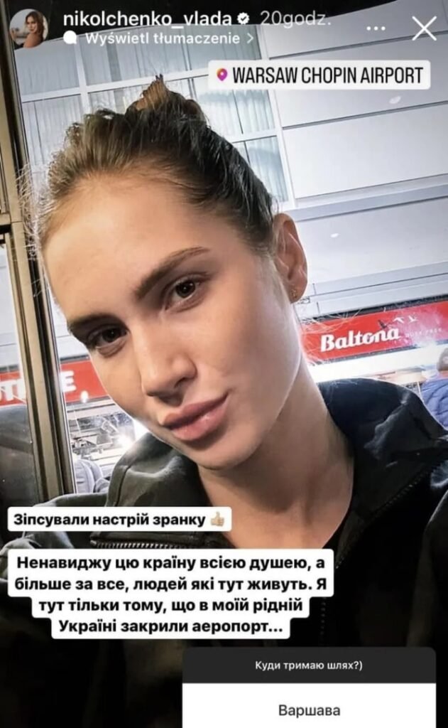 «Испортили настроение с утра. Ненавижу эту страну всей душой, а больше всего — живущих тут людей. Я тут только потому, что в моей родной Украине закрыли аэропорт», — написала Никольченко находясь в варшавском аэропорту, откуда должна была вылететь в Дубай.