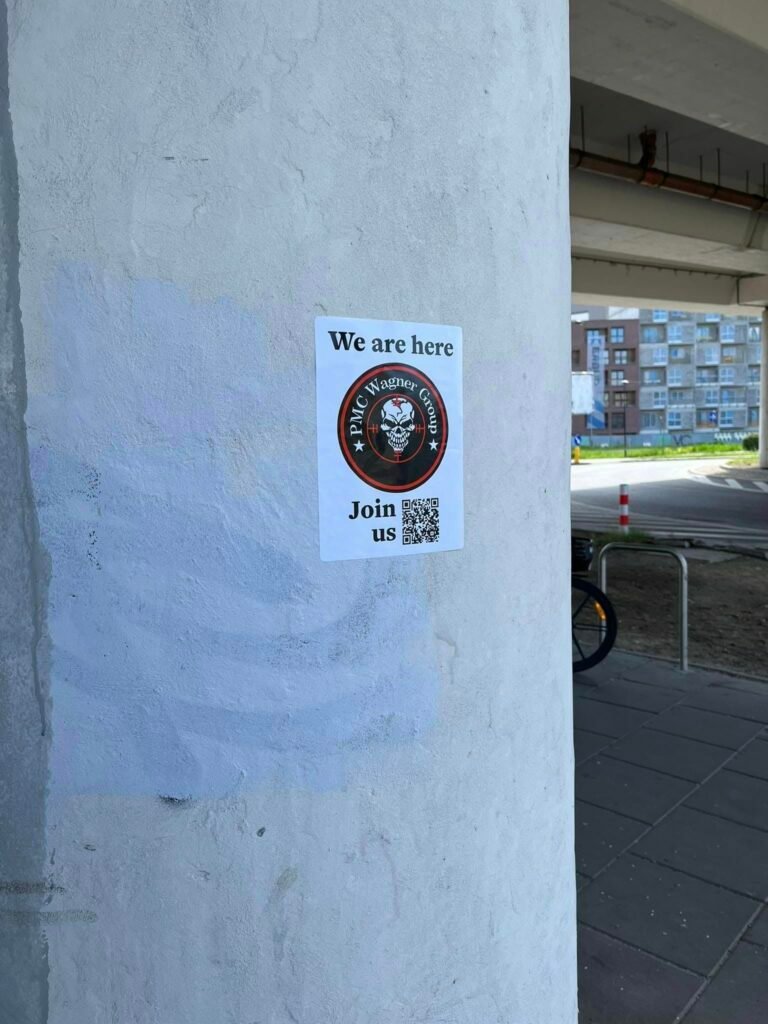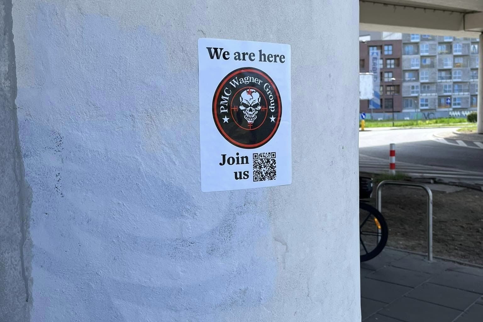 В разных частях Кракова появились наклейки, призывающие вступить в Группу Вагнера. Об одной из них сообщил городской советник Лукаш Вантух в своём профиле в Фейсбук.
