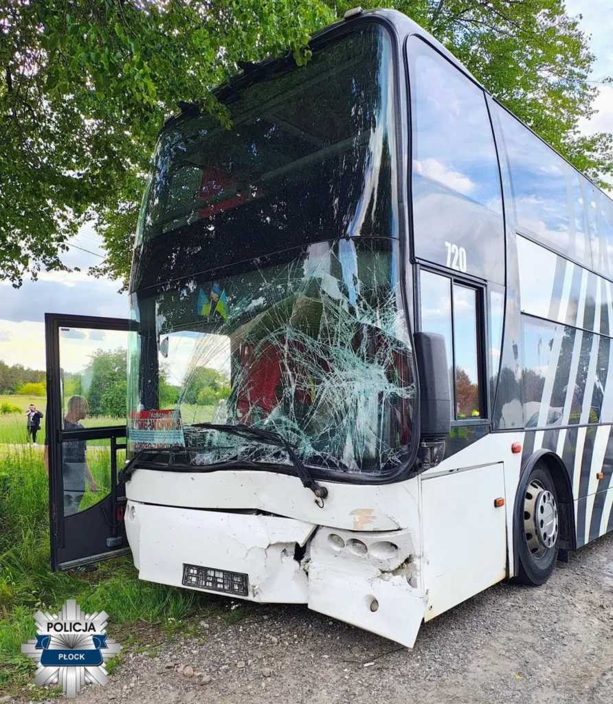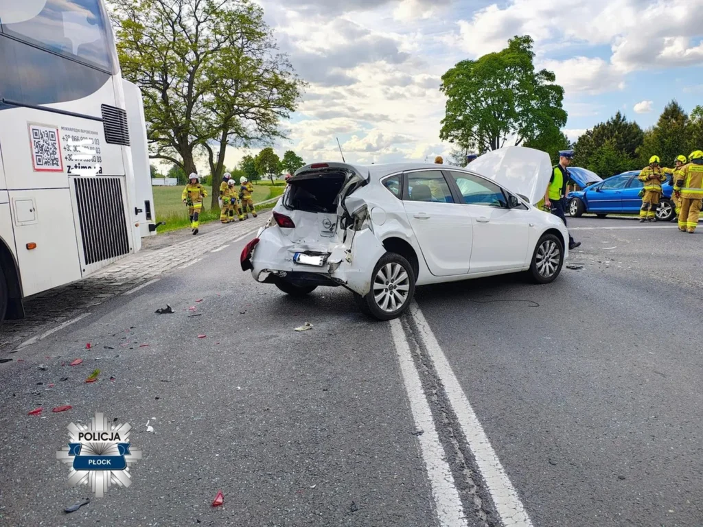 В субботу, 24 мая, на трассе №62 в Цекануве автобус столкнулся с тремя легковыми автомобилями. По данным полиции, водитель автобуса не выдержал дистанцию и врезался в Opel, за рулём которого была 23-летняя женщина. Opel отбросило на встречную полосу, где он столкнулся с Renault, а затем — с Peugeot. В больницу попали водители Opel и Renault, а также пассажир последнего.