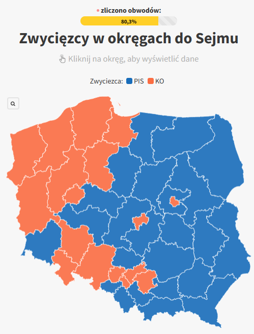 В настоящий момент подсчитано 80,3% голосов. Результаты партии Ярослава Качиньского снижается, а оппозиция набирает обороты. Согласно последним данным результатам у партии «Prawo i Sprawiedliwość» 36,72%, а Koalicja Obywatelska (КО)— 27,9% голосов. Trzecia Droga — 14%. Lewica — 8,6% и Konfederacja —6,8%.