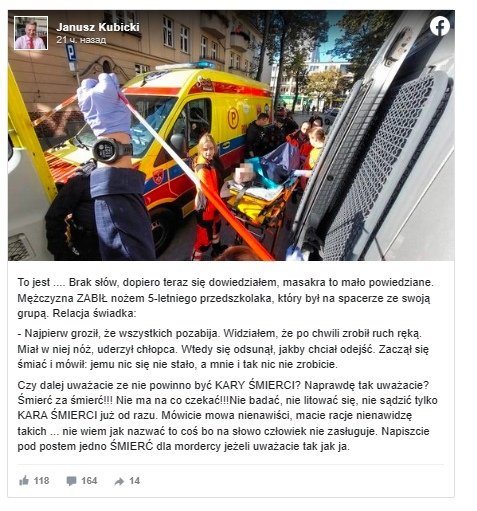 Страшная трагедия произошла в среду, 18 октября, около 10:00 на улице Karwowskiego в Познани. 71-летний Збыслав Ц. подошёл к группе дошкольников, которые шли на почту со своими воспитателями, чтобы отправить открытки, и ударил мальчика ножом в грудь. К сожалению, Maurycy скончался на операционном столе в больнице.