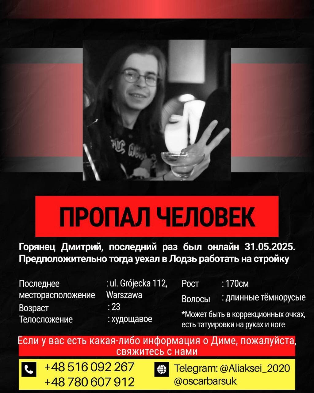 В Польше пропал 23-летний гражданин Беларуси — Горянец Дмитрий. Последний раз был в сети 31 мая 2025, предположительно тогда уехал в город Лодзь из Варшавы работать на стройку. Последнее местонахождение: ul. Grójecka 112, Warszawa.