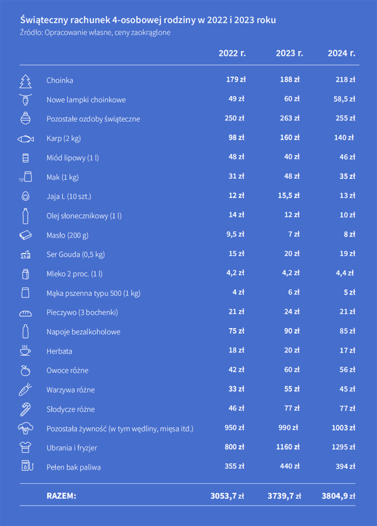 Согласно расчётам, в этом году семьи из четырёх человек на подготовку к праздникам потратит более 3800 злотых. Это немного превышает показатели 2023 года, когда средняя сумма расходов составила 3739,7 злотых.