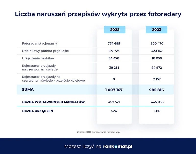 По данным Главной инспекции автомобильного транспорта Польши, несмотря на увеличение количества устройств мониторинга, было выявлено меньшее количество случаев нарушений (985 816), чем в прошлом году (1 007 167 нарушений). В 2023 году на польских дорогах было установлено 586 устройств мониторинга дорожного движения, что на 62 устройства больше, чем в 2022 году.