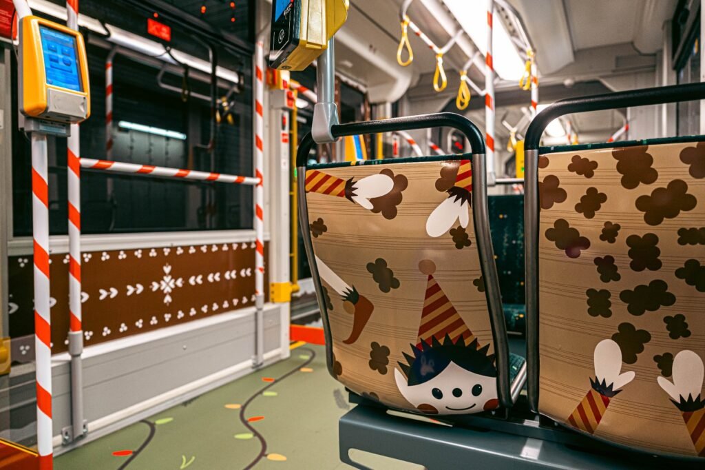 Интерьер вагона также отражает атмосферу праздников — стены и пол украшены стикерами, а современная ароматизация наполняет воздух запахом пряников.