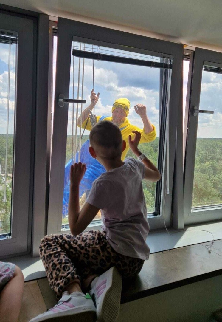 В этот день маленькие пациенты смогли увидеть за окнами больницы качающегося миньона, человека-паука, различных животных и персонажей из мультфильмов. Участники мероприятия не только висели вниз головой и выполняли акробатические трюки, но и играли с детьми в «крестики-нолики» на стекле.