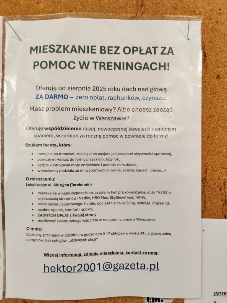 Автор предлагает бесплатное проживание (без оплаты аренды, счетов, коммунальных услуг) в большой, современной студии с отдельным спальным местом, расположенной на улице Aluzyjna (Тархомин). Квартира полностью оборудована, включая стиральную машину с функцией сушки, большой телевизор с доступом к стриминговым сервисам, Wi-Fi и некоторое спортивное оборудование.