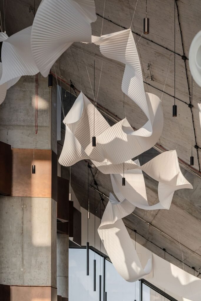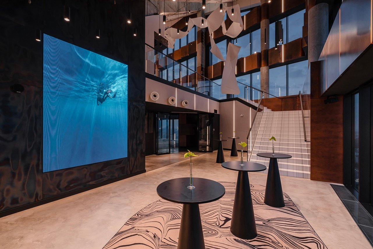 Проекта интерьера был выполнен основываясь на нейтральность и неочевидное сочетание материалов. Там можно увидеть медные зеркала, бра из полупрозрачной смолы, шпона чечот, бетона, фрезерованного МДФ или оксидированной стали. Функциональные возможности дополняются технологическими решениями, такими как мультимедийные экраны, проекторы или профессиональная звуковая система. Внедрены специальные акустических решения, чтобы избежать эффекта эха.