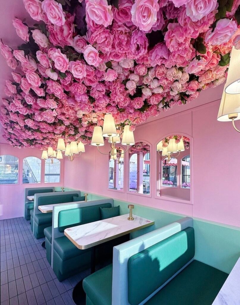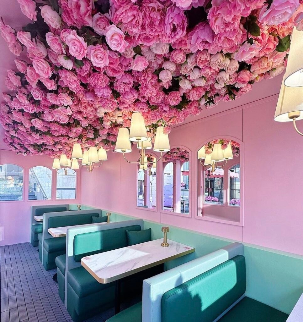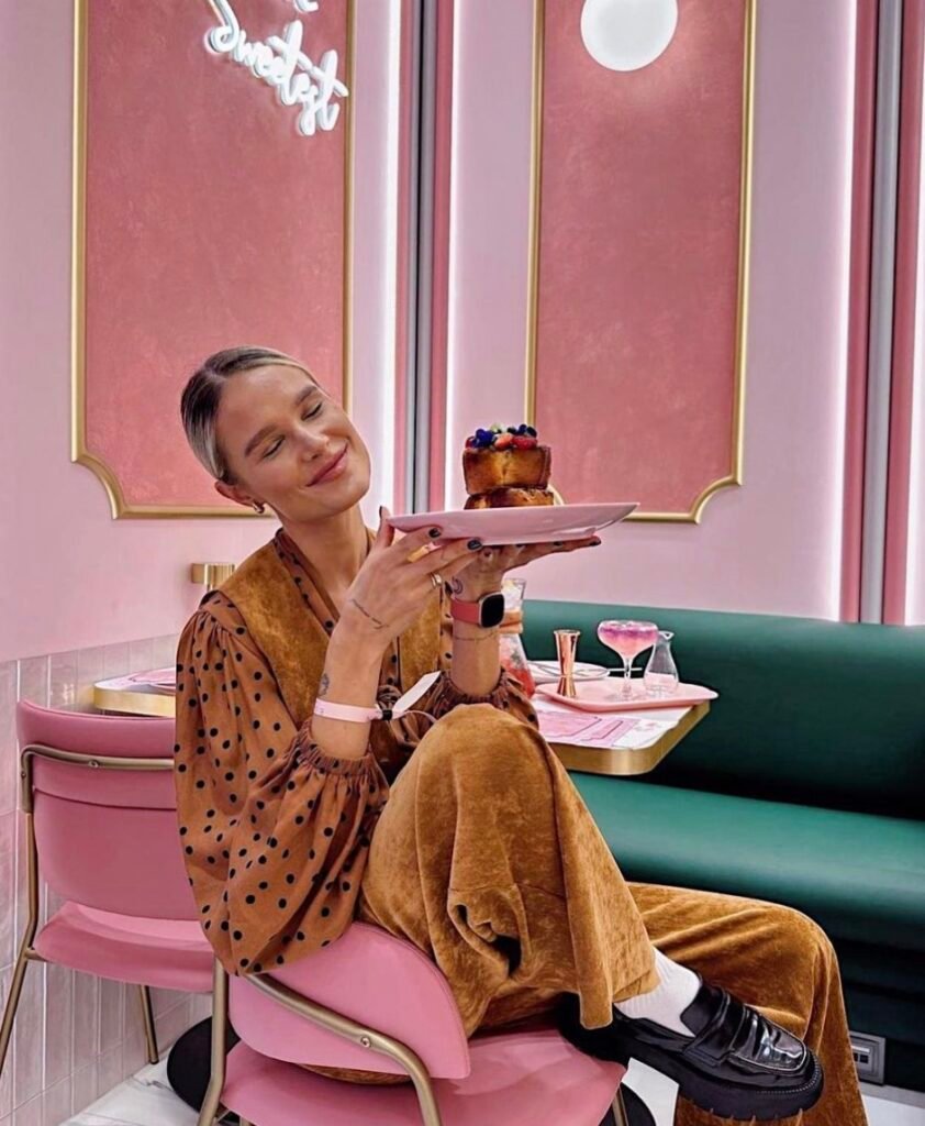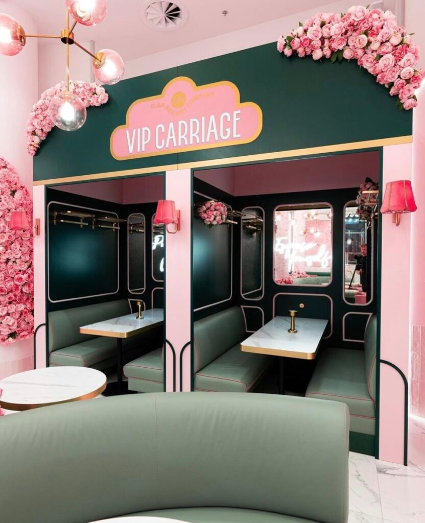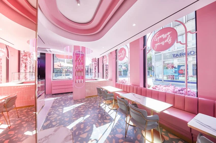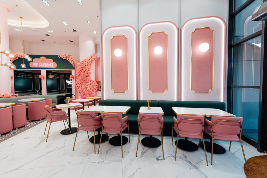 Интерьер варшавского кафе вдохновлён атмосферой вокзалов прошлого века и предлагает гостям фотогеничное пространство: розово-зелёная палитра, ретро-купе, стилизованная билетная касса и фирменные неоновые надписи создают идеальный фон для ярких снимков.