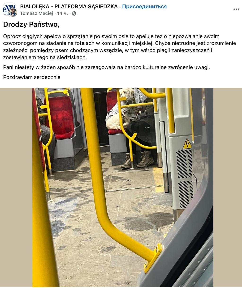 В одной из групп варшавского района Бялоленка интернет-пользователь обратил внимание на женщину, которая позволяла своей собаке сидеть на сиденье в общественном транспорте.