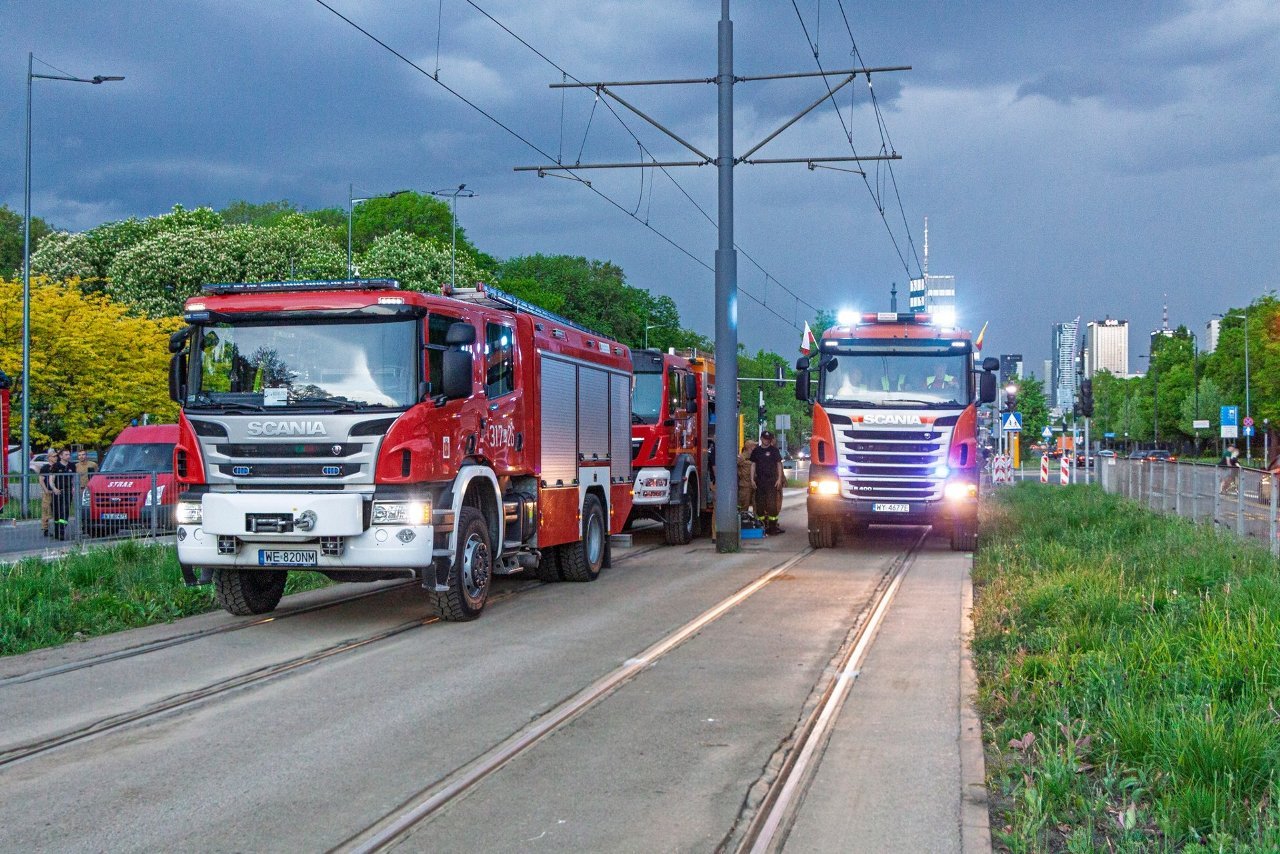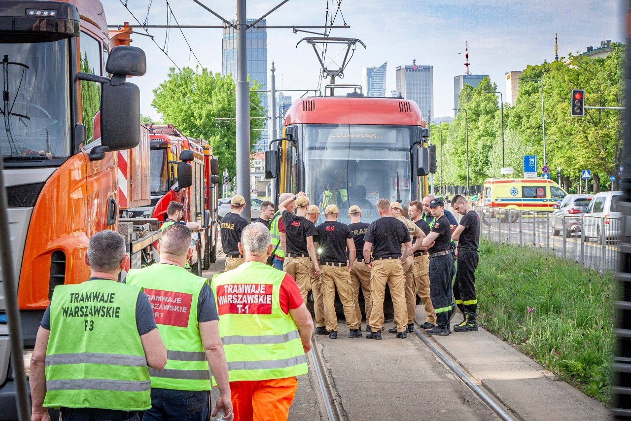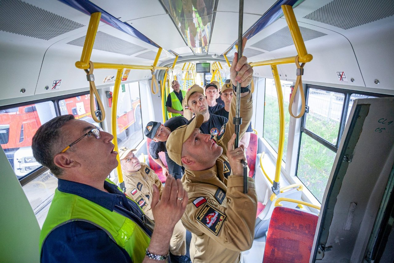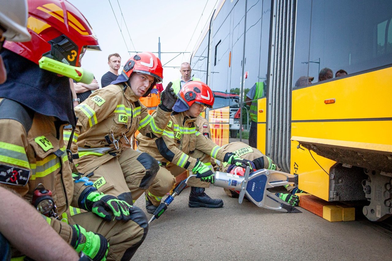Варшавские пожарные совместно с варшавскими трамваями провели масштабные учения на закрытом участке трамвайных путей, в ходе которых отрабатывались действия по спасению людей, оказавшихся под вагоном, включая отключение трамвая от электросети и его подъем с помощью крана.