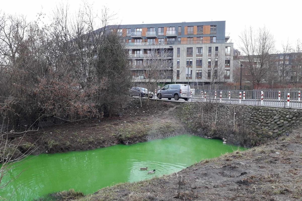 В Варшаве произошла утечка красителя в магистрали теплосети — вода в канале окрасилась в зелёный цвет
