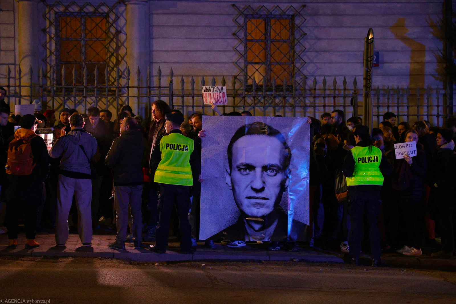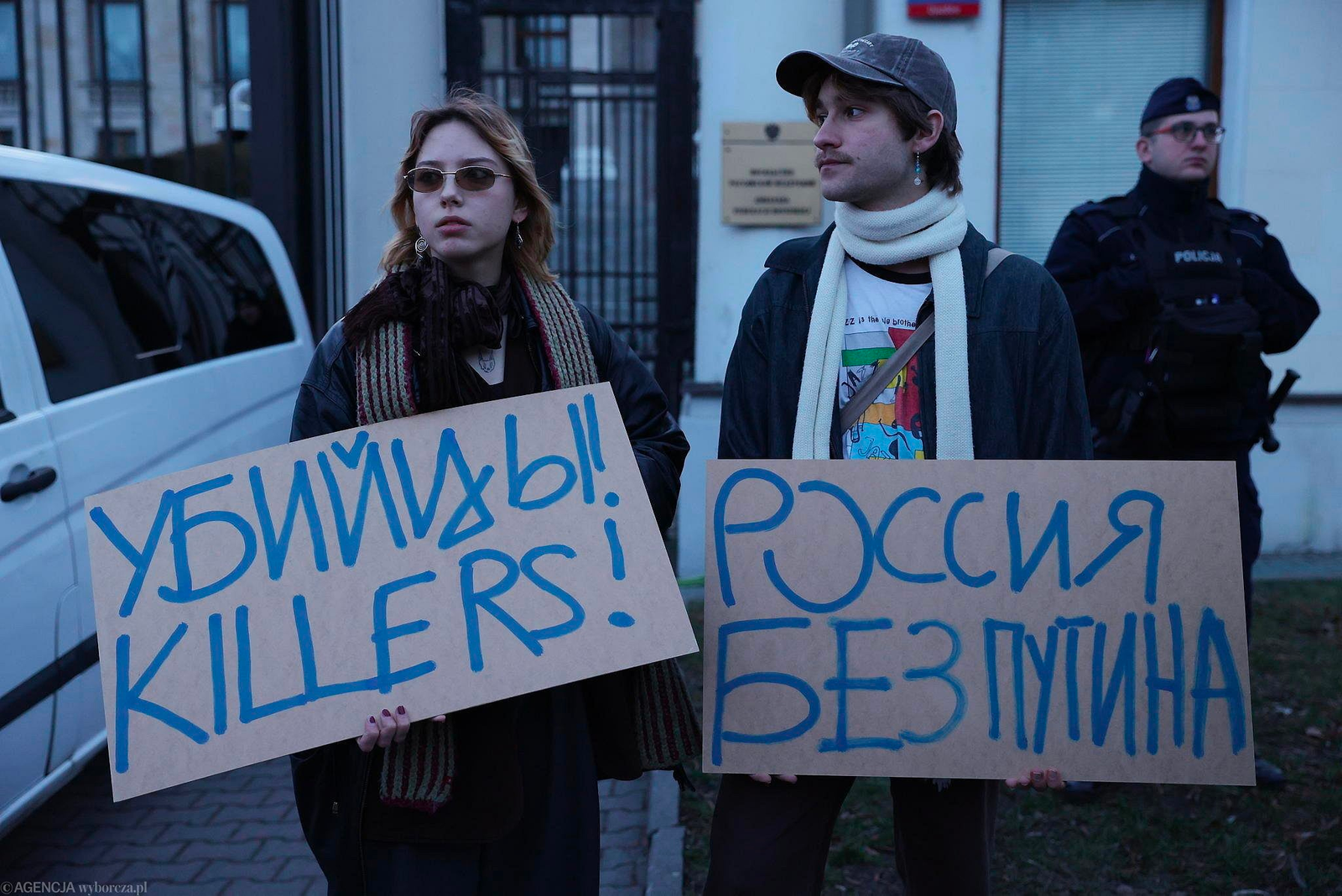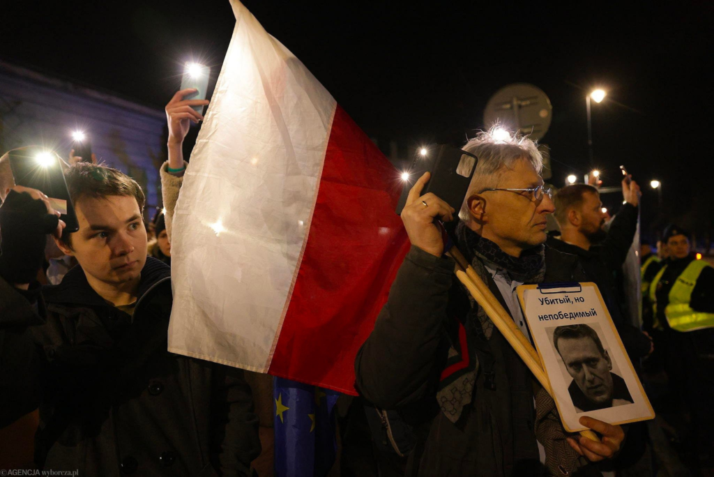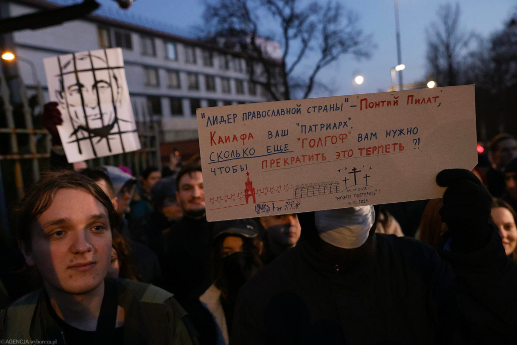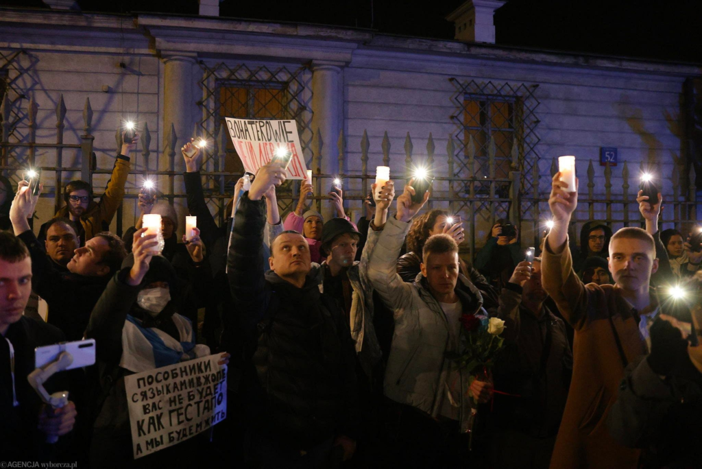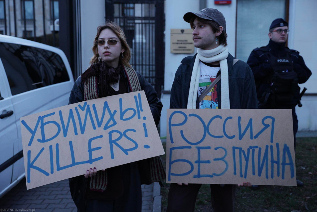 Перед посольством России в Варшаве собралось несколько сотен человек. Большинство из них — россияне, проживающие в Польше, также присутствовали и граждане Беларуси.