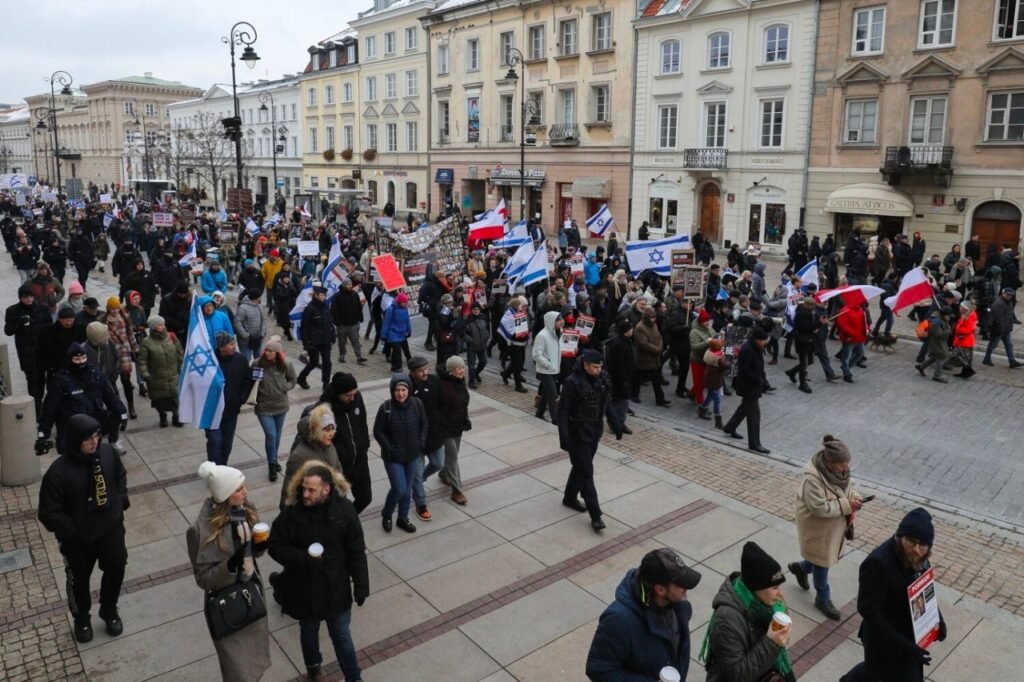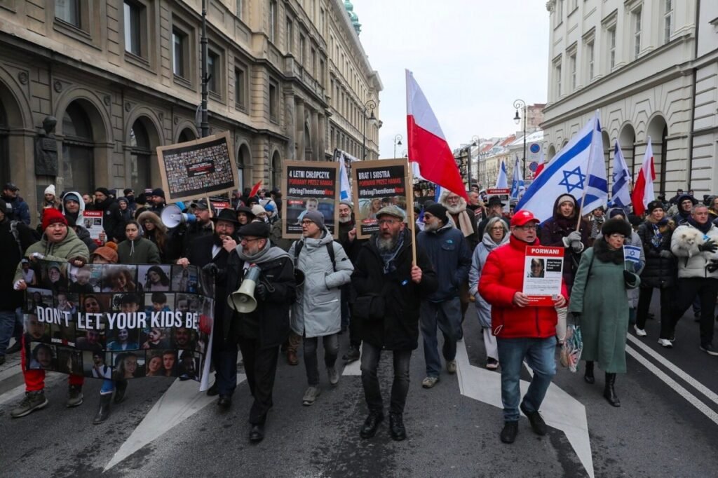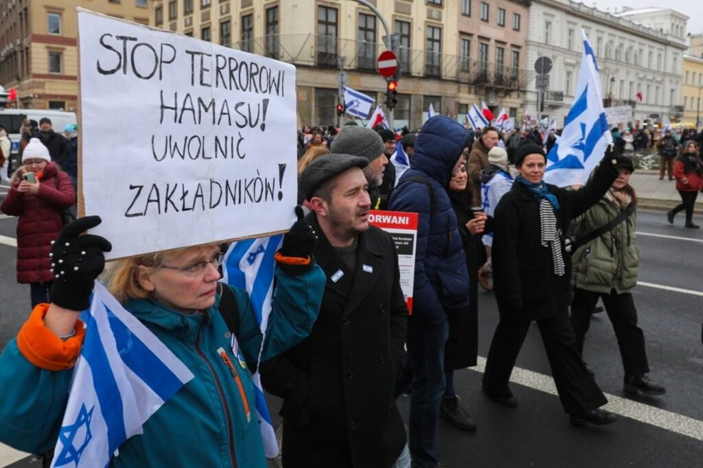 Встреча началась Замковой площади, а затем участники прошлись по маршруту: Краковское Предместье — Новы Свят до Рондо де Голля. Там собралось несколько сотен человек со всей Польши. Демонстранты несли транспаранты, на которых, среди прочего, было написано: «Израиль, ты не один!», «Остановите террор Хамаса! Освободите заложников» и др..