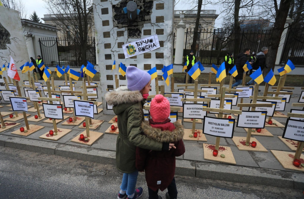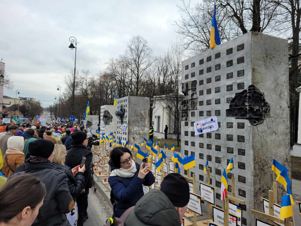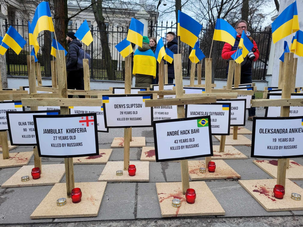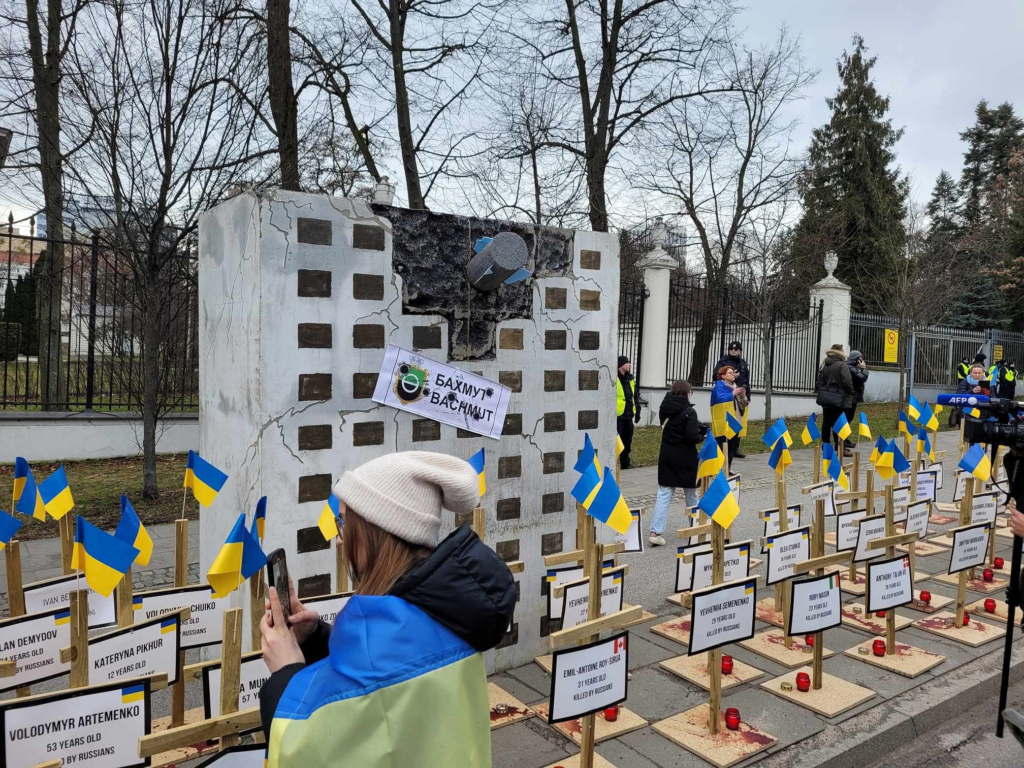 Перед зданием посольства была установлена инсталляция — макеты многоквартирных домов, разрушенных российскими бомбами. К каждому приклеен листок с названием украинского города, в том числе: Бахмут и Мариуполь. Перед моделями блоков также стоят десятки деревянных крестов с украинскими флагами и свечами. На каждом есть имя жертвы, возраст и пометка «killed by russians».