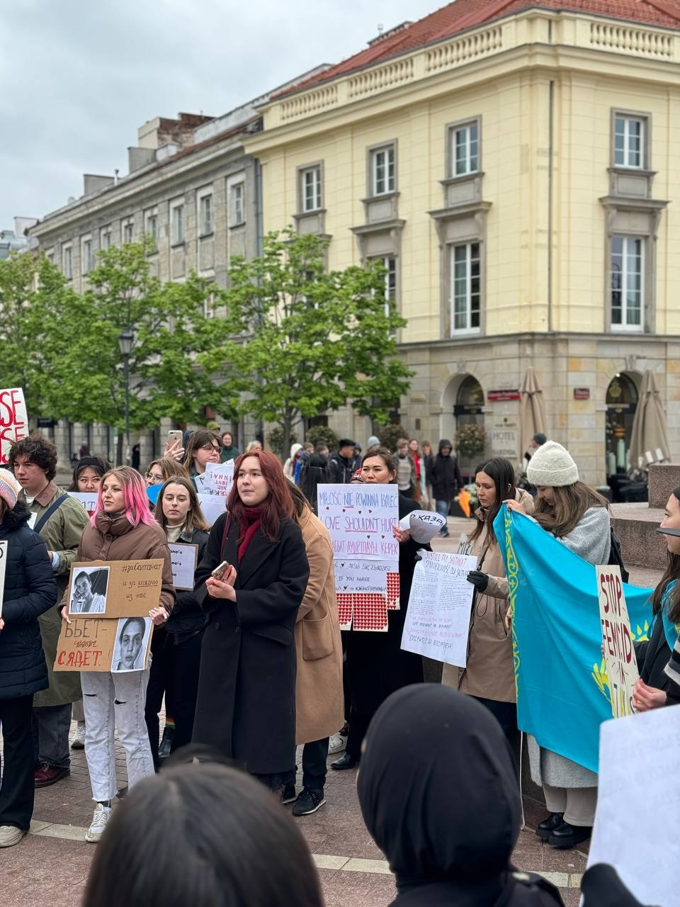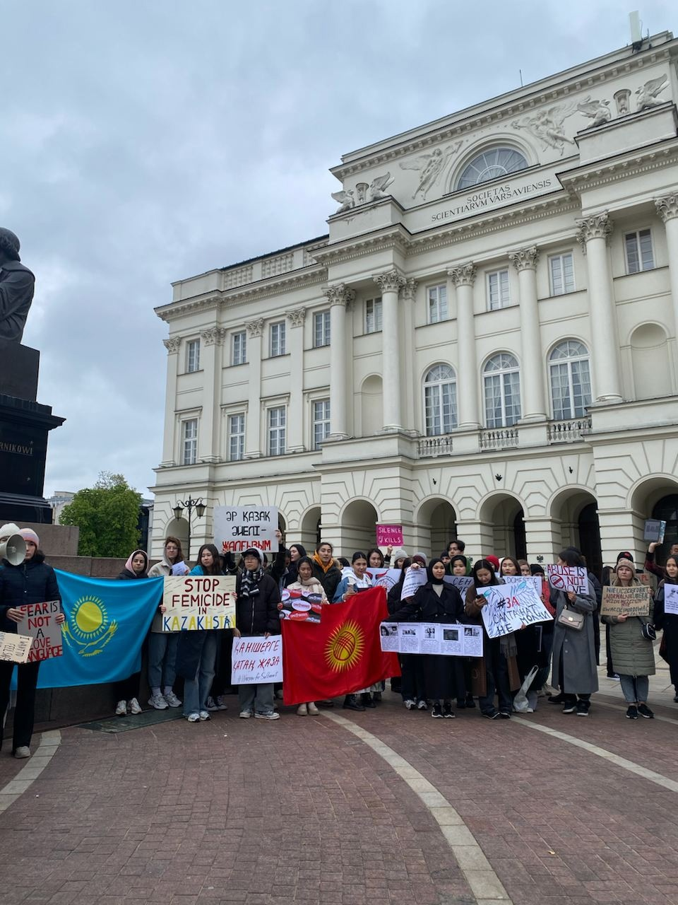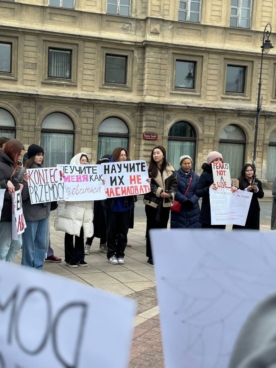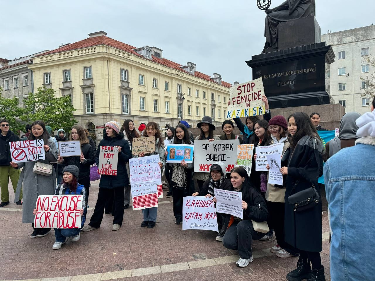 На митинге можно было увидеть плакаты на казахском, русском, английском и польских языках, среди них: «Научите их не насиловать», «Бьёт, значит сядет», «Не учите меня, как одеваться» и другие.