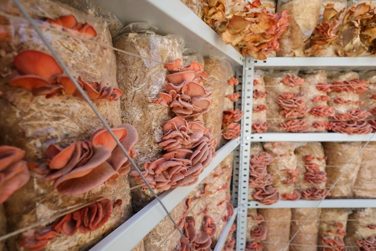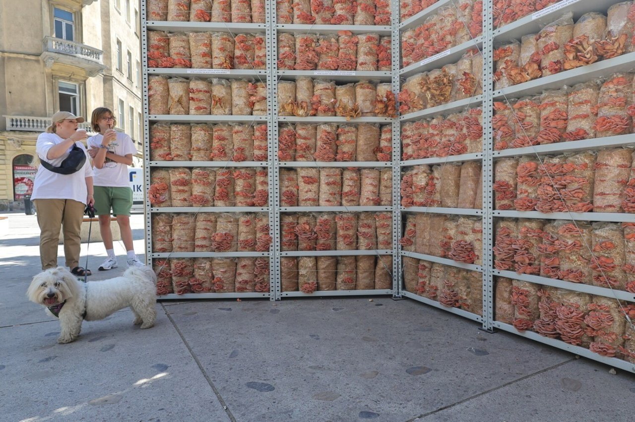 Для создания проекта студенты использовали переработанные стеллажи для хранения продуктов, а также главный элемент тюки розовых вешенок. Грибы должны расти и тем самым менять свой внешний вид. В конце проекта инсталляция превратится в большую яркую розовую массу.