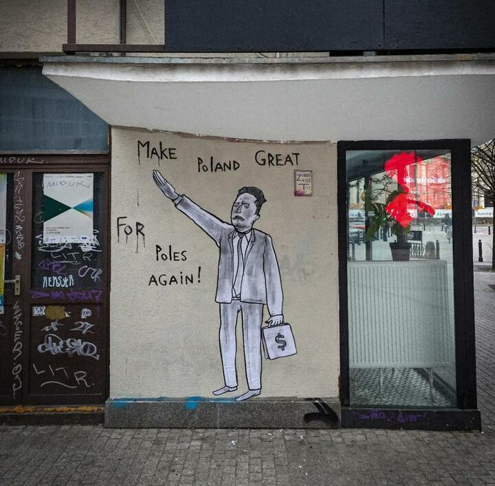 Уличный художник создал постер-арт, на котором изображён человек, с поднятой вверх рукой, внешне напоминающий Илона Маска. Под картинкой размещена надпись: Make Poland great for Poles again! («Сделаем Польшу снова великой для поляков!»), отсылающая к известному политическому лозунгу Make America great again, который часто используется Дональдом Трампом и его сторонниками, включая Маска. Постер был размещен напротив небоскрёба по адресу Złota, 44, где Маск планирует приобрести квартиру. Подробнее об этом мы писали в статье ниже.