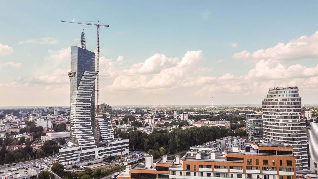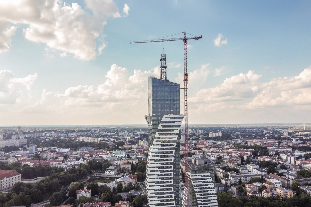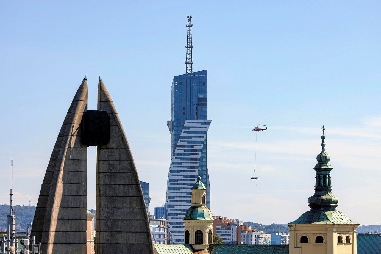 Во вторник, 13 августа, на день раньше намеченного срока, завершилась сборка последних элементов башни и шпиля самого высокого небоскрёба в Польше, который является частью паркового комплекса Ольшинки в Жешуве. Установленные элементы сделали здание самым высоким жилым строением в Польше с высотой до крыши 161 метр и общей высотой со шпилем 220,67 метра.