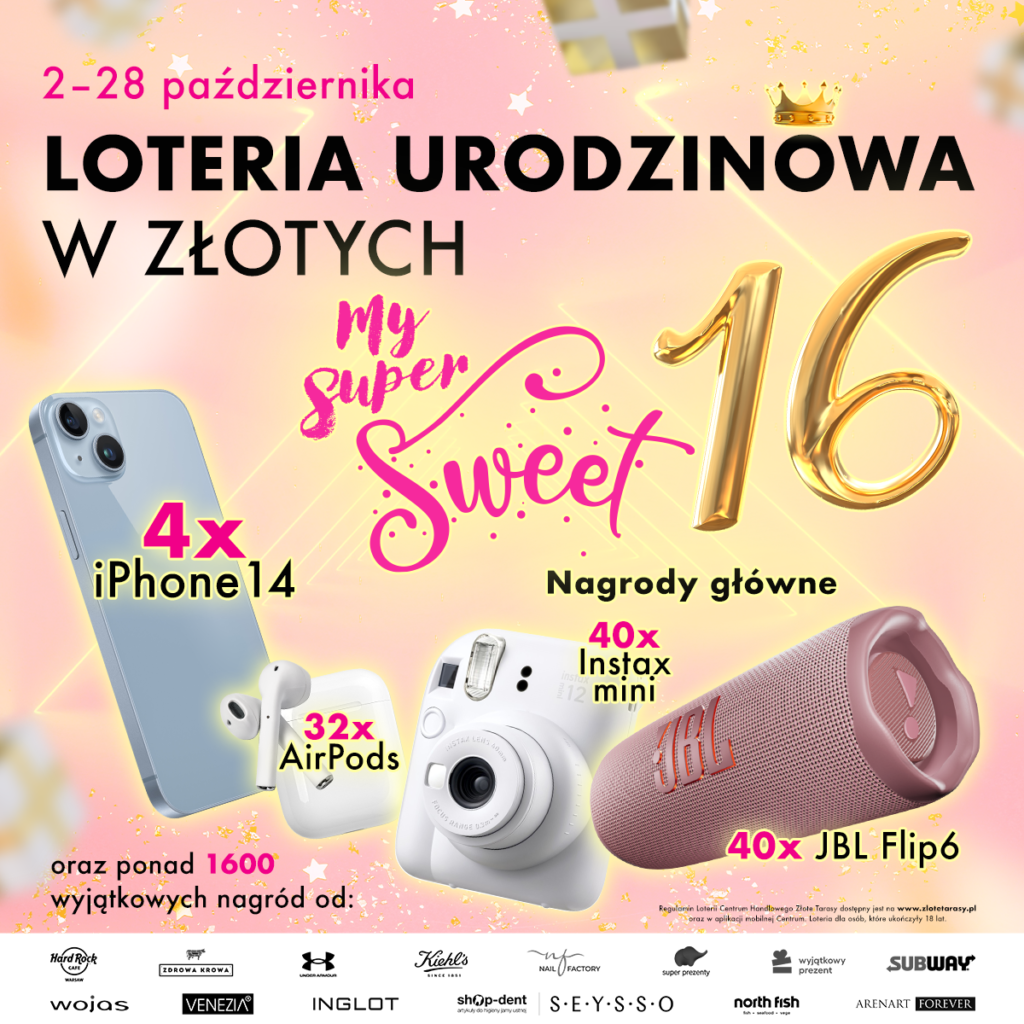 Всего будет разыграно iPhone 14 (4 шт.), AirPods (32 шт.), Instax mini (40 шт.), JBL Flip 6(40 шт.) и более 1600 призов от партнеров «Złote Tarasy».