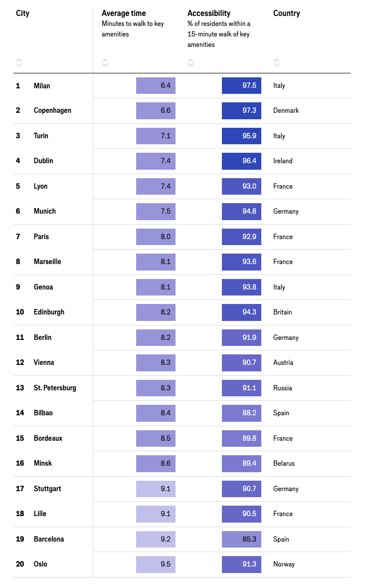 1-е место рейтинге занял Милан (среднее время в пути до основных удобств составляет 6,4 мин.) На 2-м месте столица Дании Копенгаген — 6,6 мин., на 3-м ещё один итальянский город — Турин (7,1 мин.).