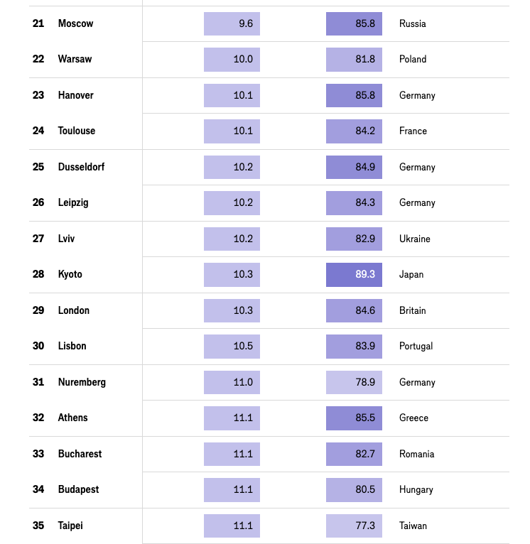 — Россия — Санкт-Петербург (13-е место), Москва (20-е место)